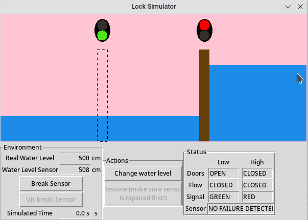 Note: The integer parameter for the events openDoors, closeDoors, openFlow, closeFlow, greenLight and redLight indicates the side of the lock this action should apply to. Allowed values are 0 (the LOW water side) and 1 (the HIGH water side). In the Statechart interface, the integer constants LOW and HIGH have been declared, so you can (and should) use these, instead of the values 0 and 1.